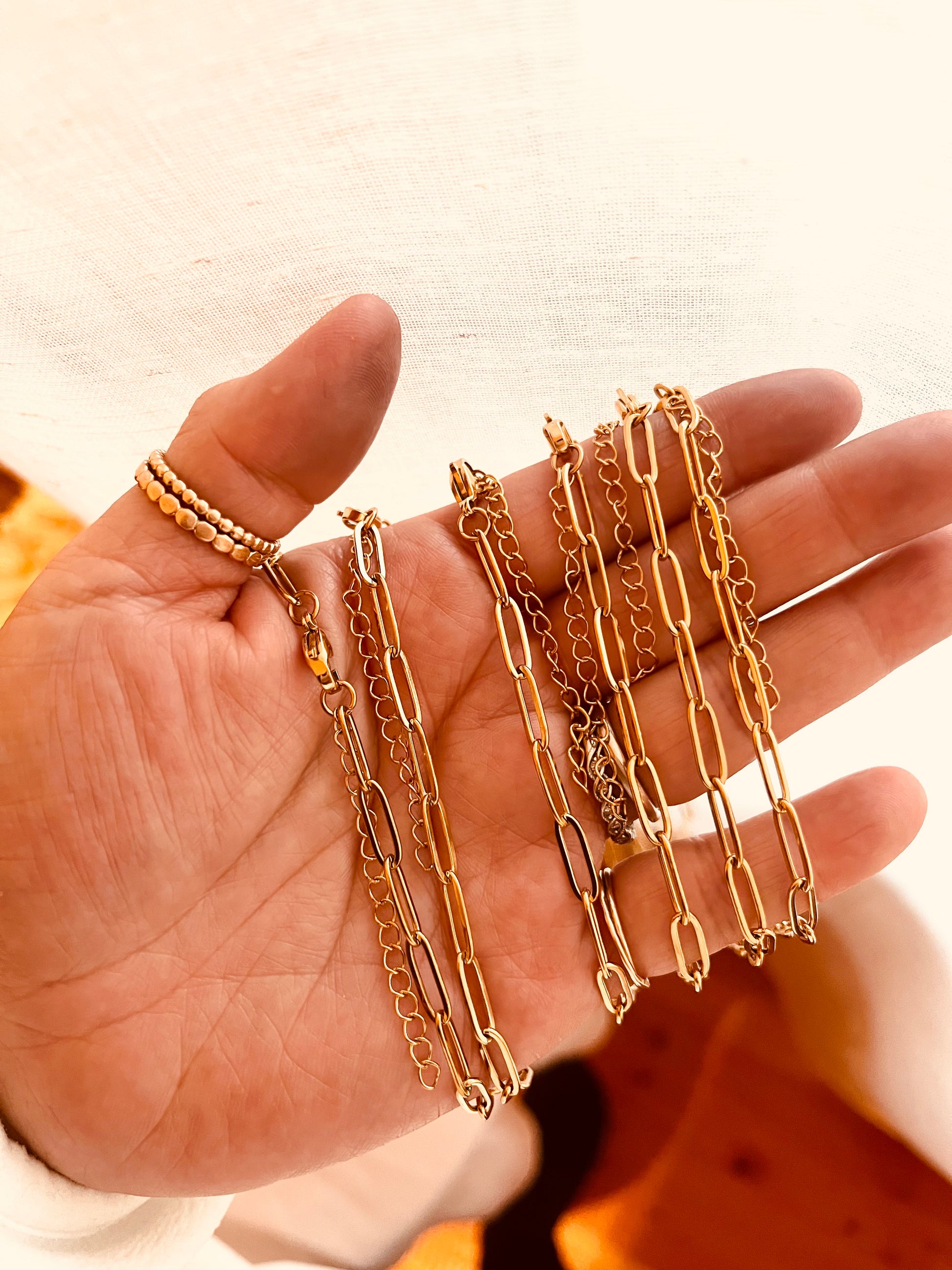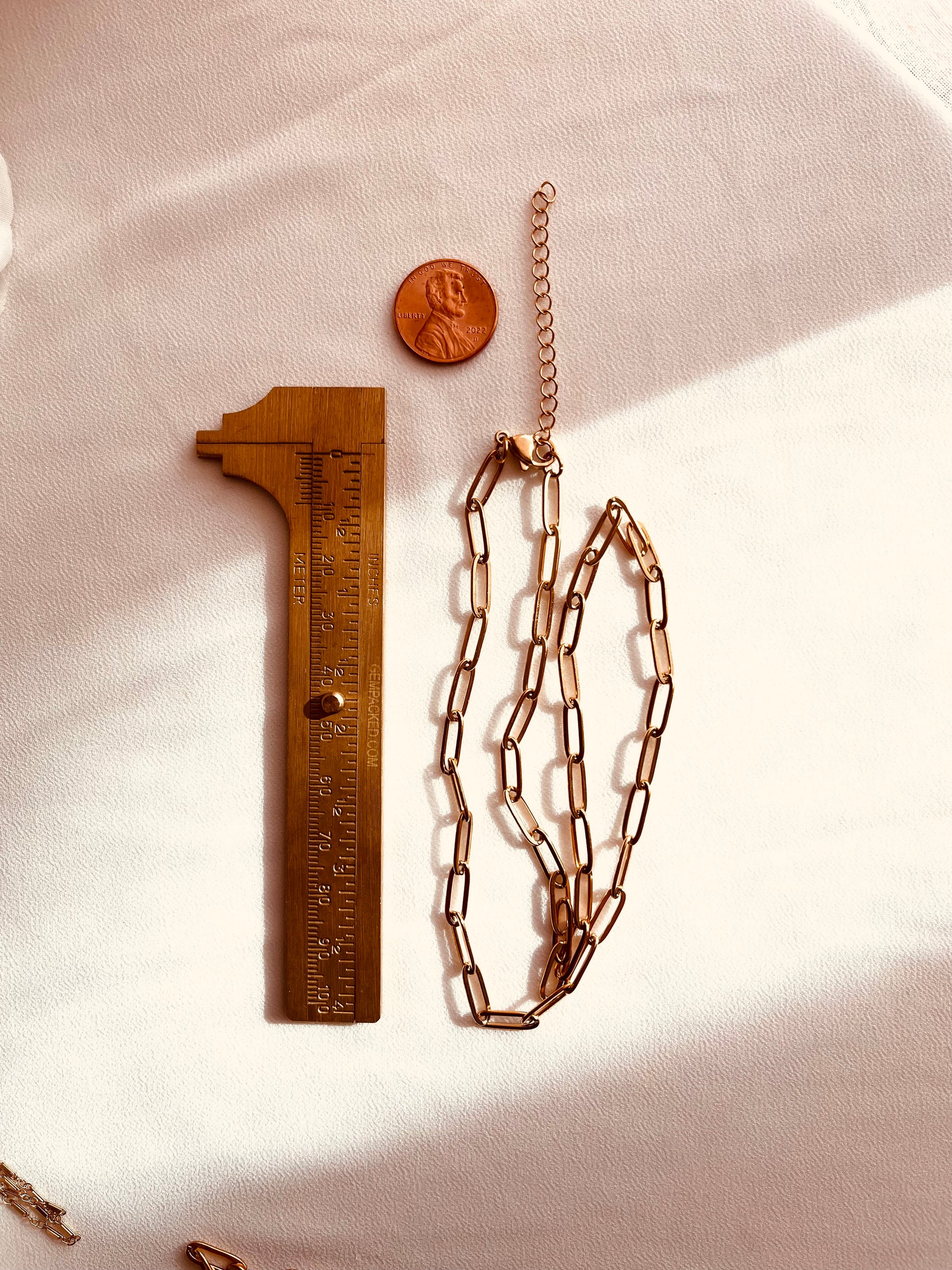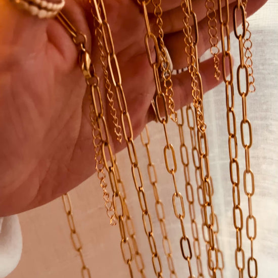 This chunky paperclip necklace is crafted from durable brass and finished with a long-lasting 18K gold PVD coating, making it waterproof, tarnish resistant, and hypoallergenic.