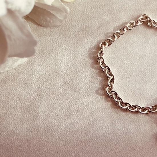 This bracelet features a chunky sterling silver–filled chain with a hand-crafted sterling silver cross charm, rings, and clasp.