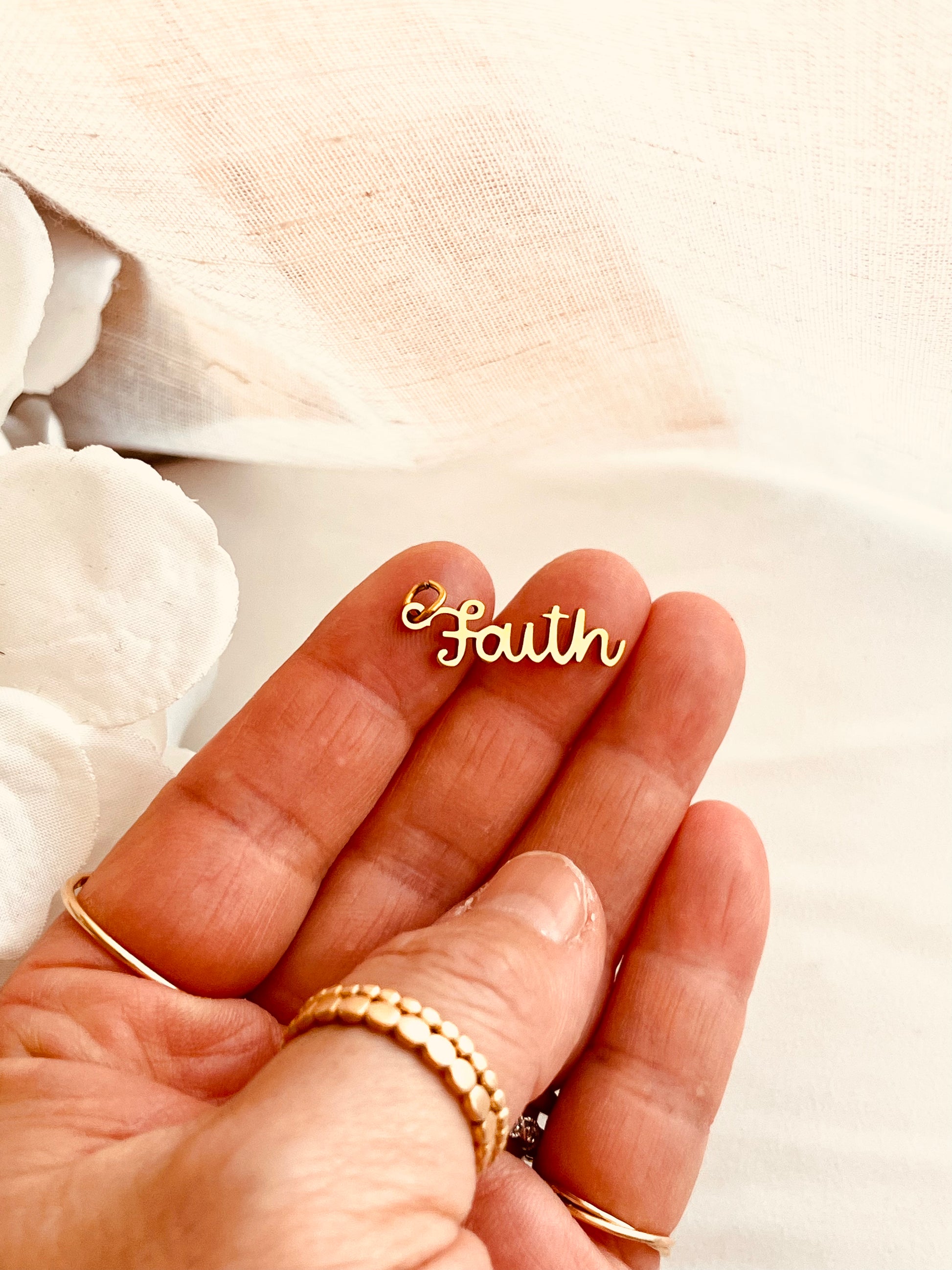 This dainty “Faith” script charm is designed to add meaning to your necklace or bracelet stack. Minimal, elegant, and lightweight — perfect for everyday wear.