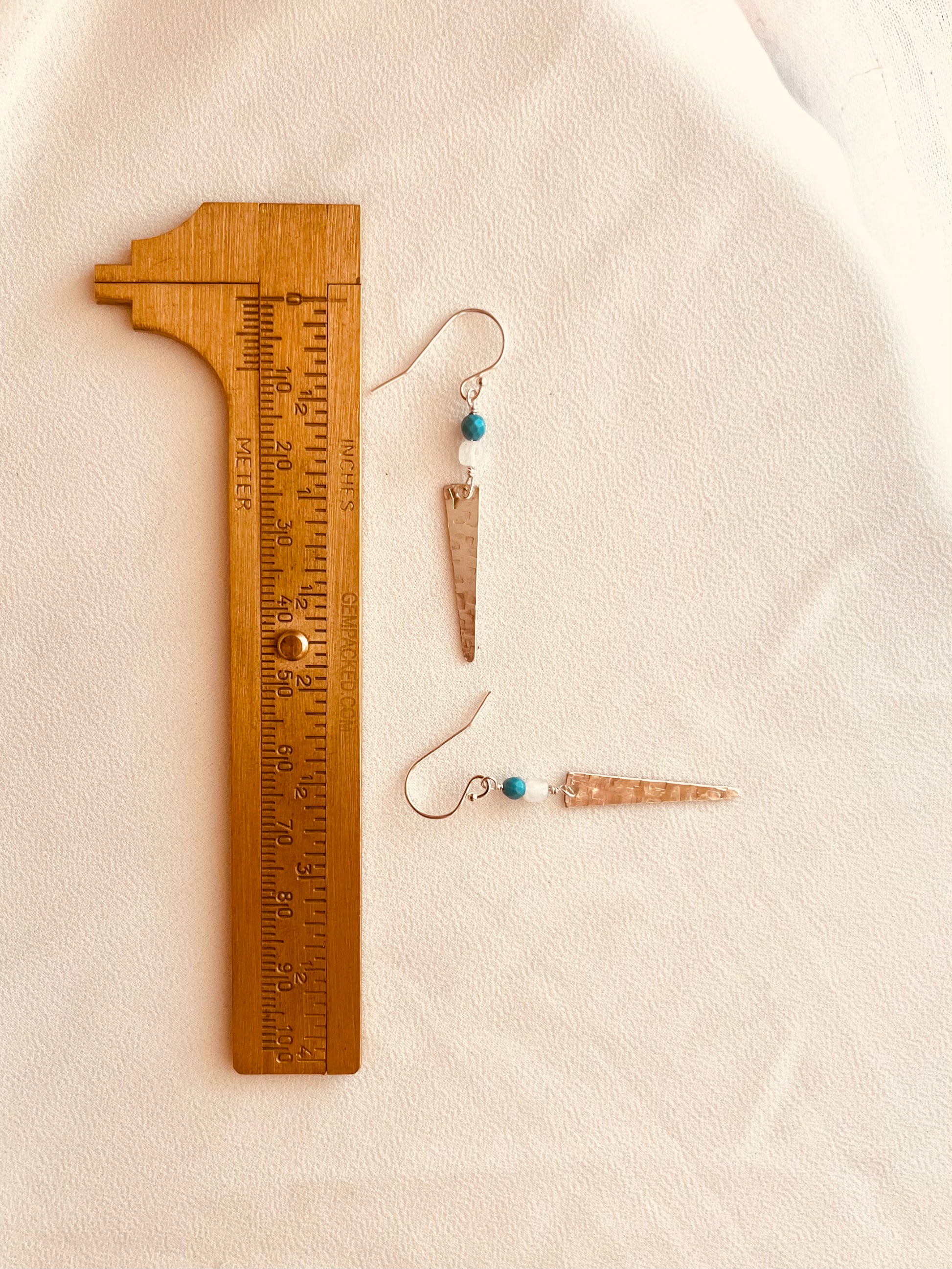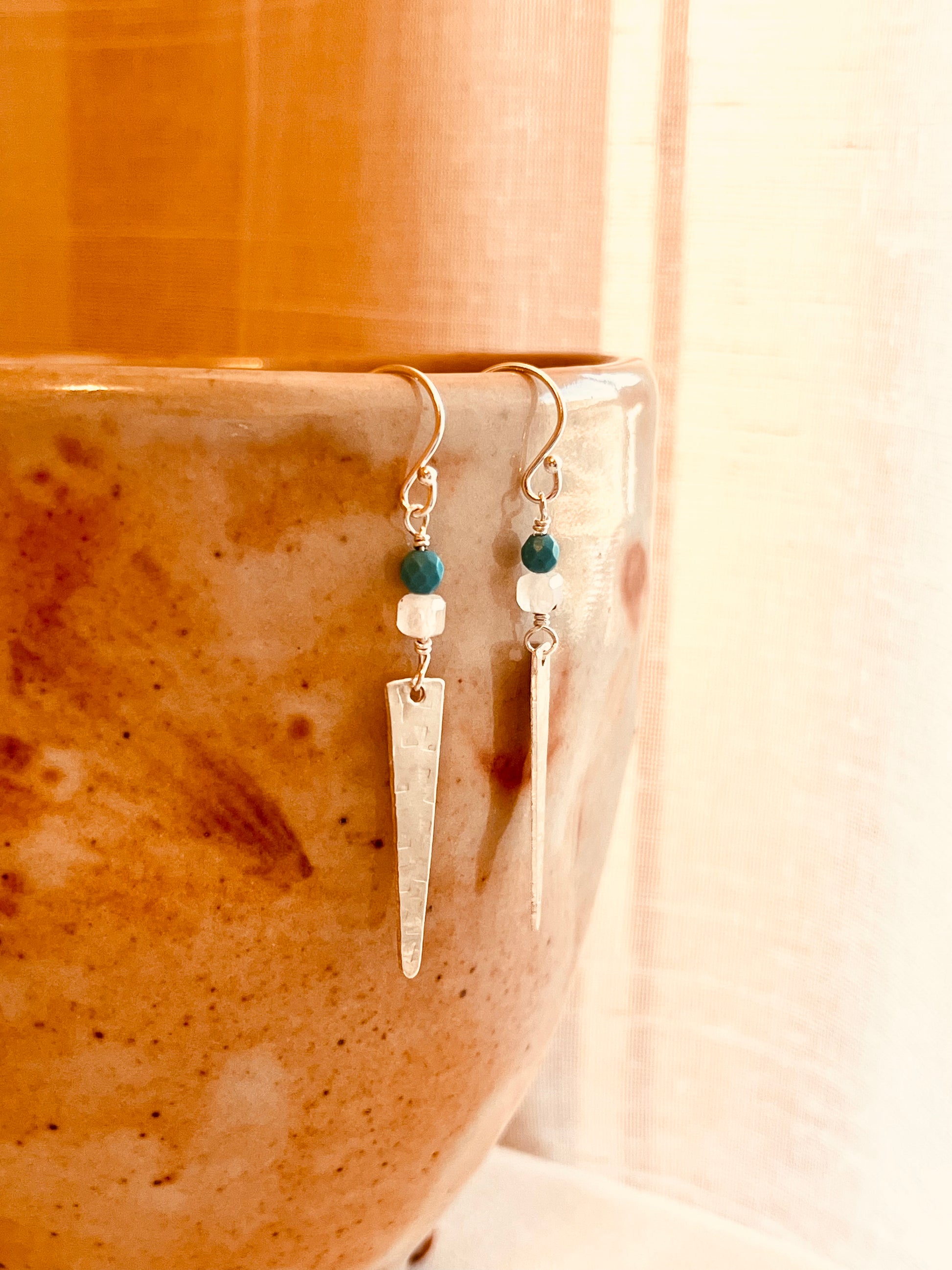 Sleek, modern, and a little bit fierce — the Silver Spears Earrings are hand-forged in sterling silver and paired with turquoise and moonstone beads for a touch of natural color. Lightweight yet striking, these earrings bring an effortless mountain-chic style you can wear every day.